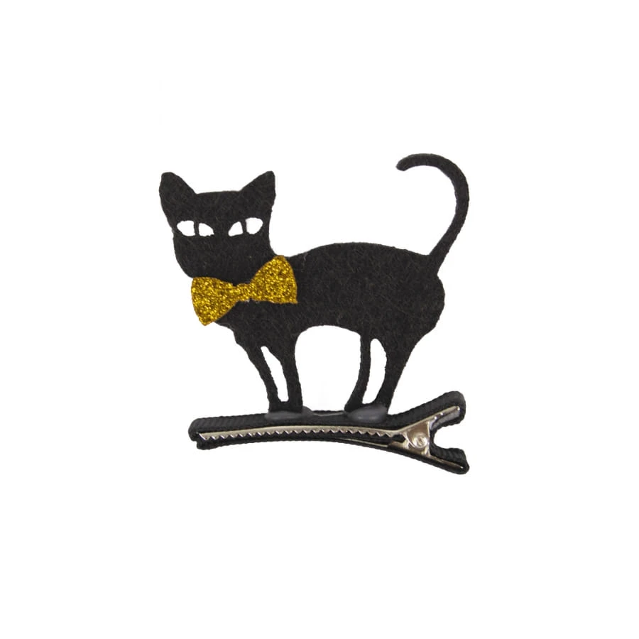 Il s’agit d’une pince à cheveux surmontée d’un petit chat noir en feutrine.