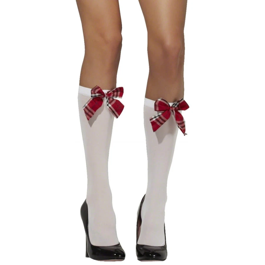 Paire de bas d’écolière, pour femme ou adolescente, de couleur blanche, noire et rouge. Les bas sont à la hauteur des mollets et un noeud de couleur rouge et noir a été cousu sur chacun des côtés. Ces bas sont idéaux pour un enterrement de vie de garçon ou de jeune fille!