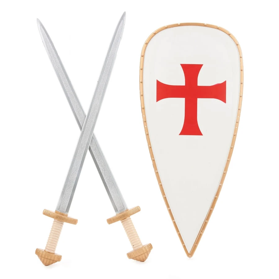 Le bouclier blanc est orné d’un liséré doré sur lequel est imprimé une croix rouge semblable à celle des croisades.