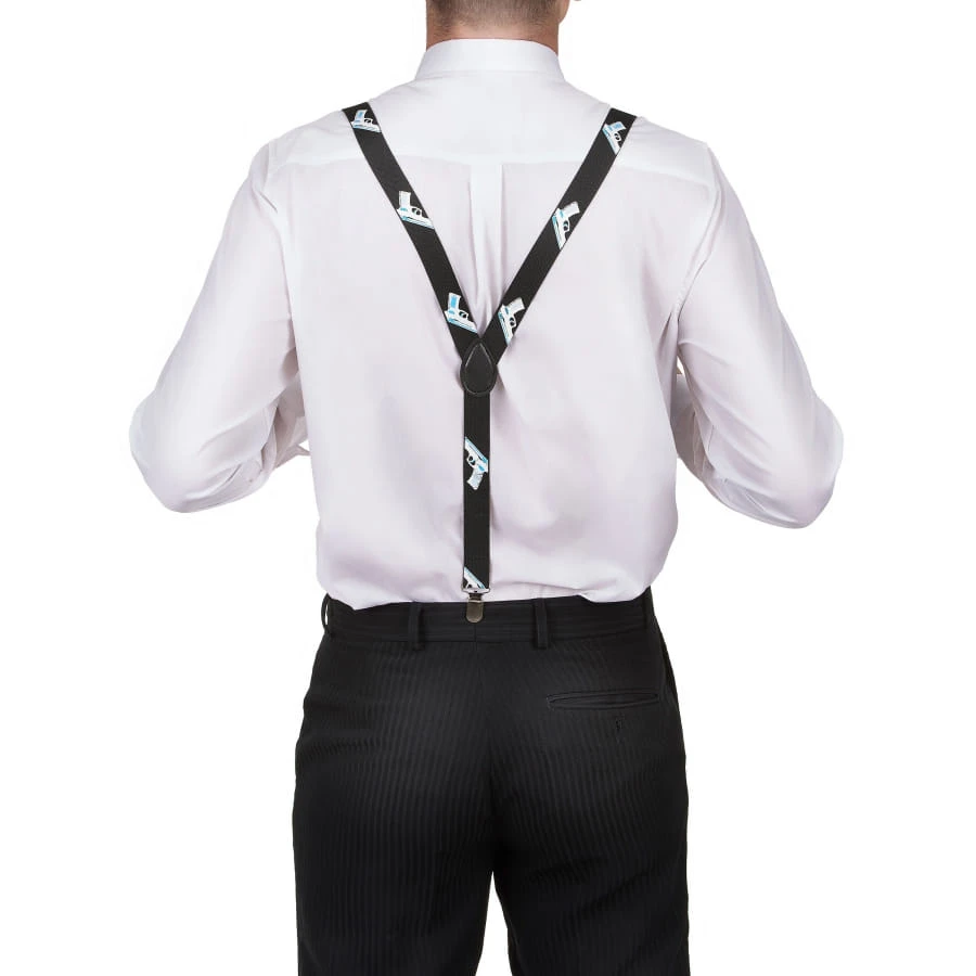Jouer au caïd de la mafia le temps d’une soirée déguisée avec nos bretelles noires imprimées révolver.