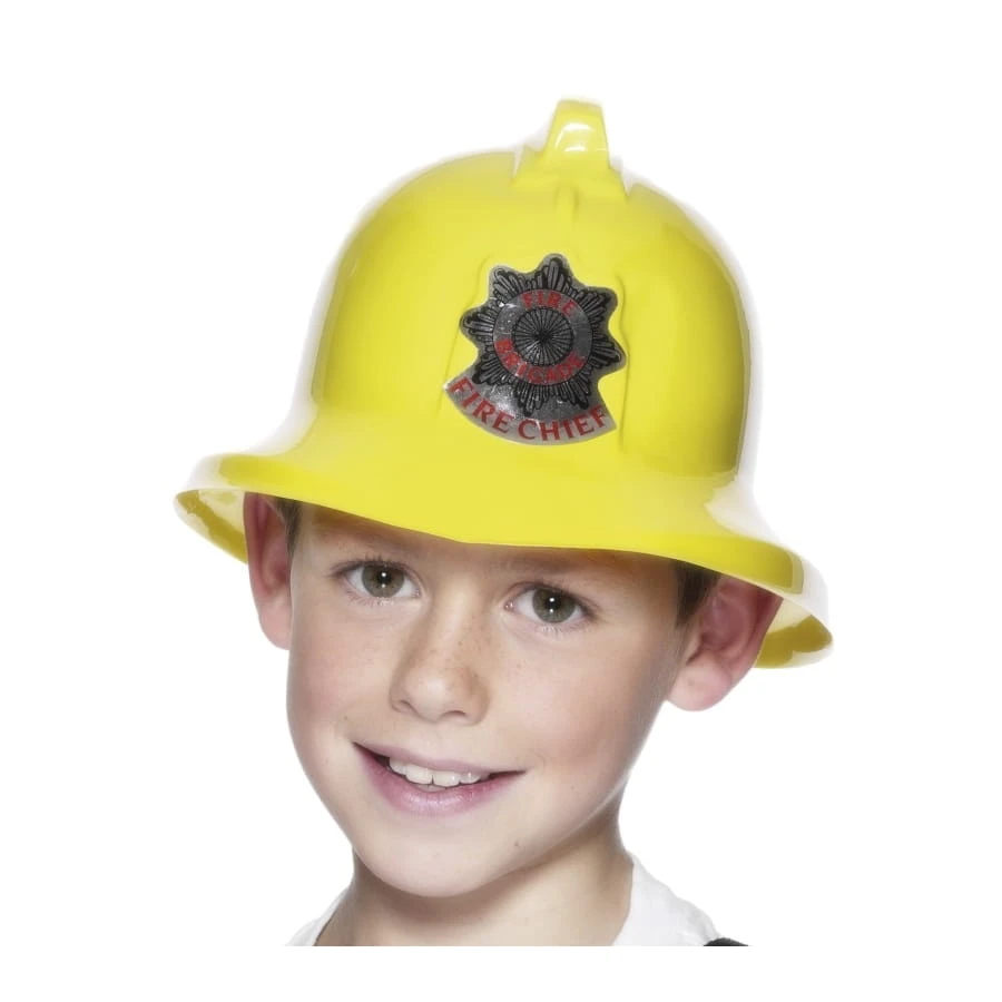 Casque de pompier de couleur jaune, avec logo de couleur dorée, noire et rouge, pour garçon. Ce casque fera plaisir à votre enfant, particulièrement s’il aime les pompiers!