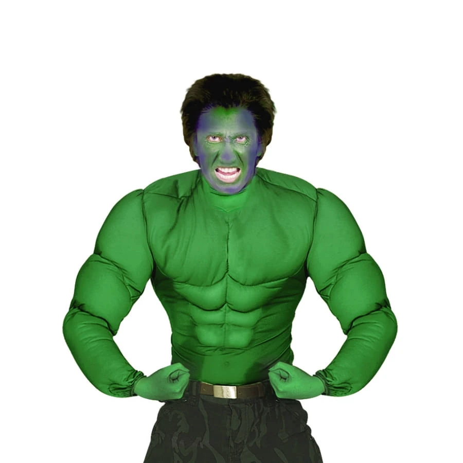 Il s’agit d’un haut vert fluo garni d’un rembourrage servant à imiter des muscles sur le torse, les bras et le buste.