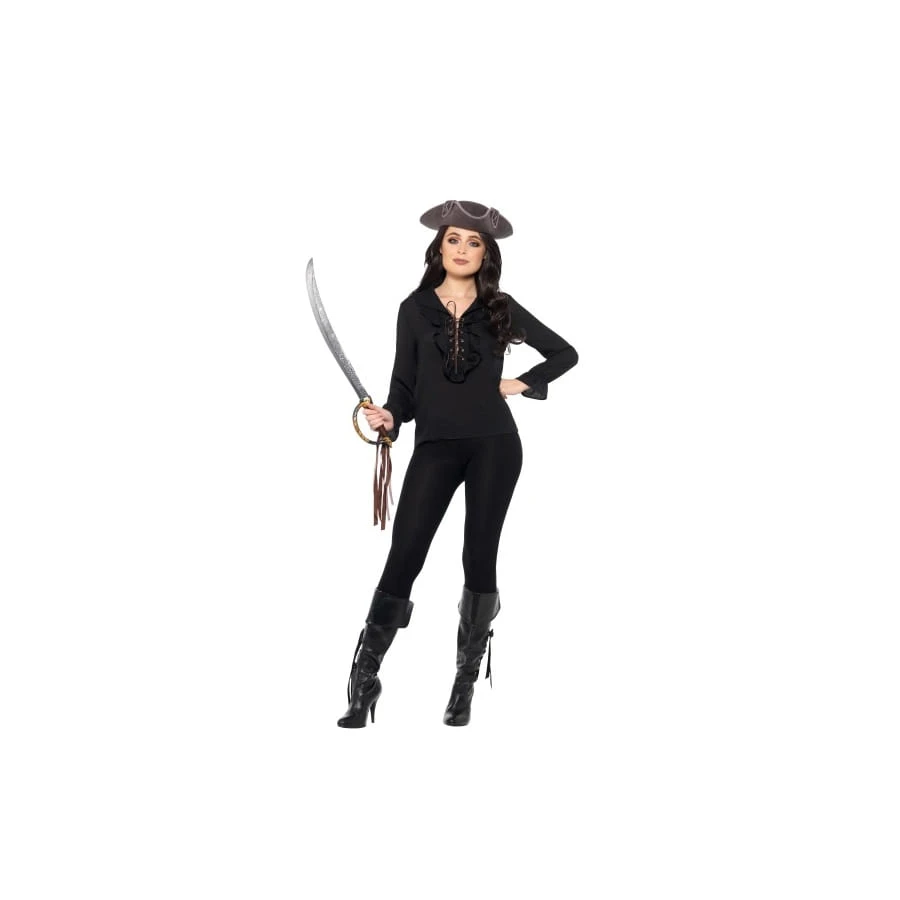 La vie de pirate est parsemée d’actions et d’embûches, mais elle vaut bien la peine d’être vécue avec ses nombreux trésors à la clé. Faufilez-vous dans la peau d’un personnage redoutable en portant cette chemise noire unie de pirate. Un tissu léger, des manches longues et évasées à partir des poignets, une coupe décontractée, un col jabot et des lacets sur le devant, voilà ce qui vous attend ! Le vêtement a été conçu pour la gent masculine et féminine.