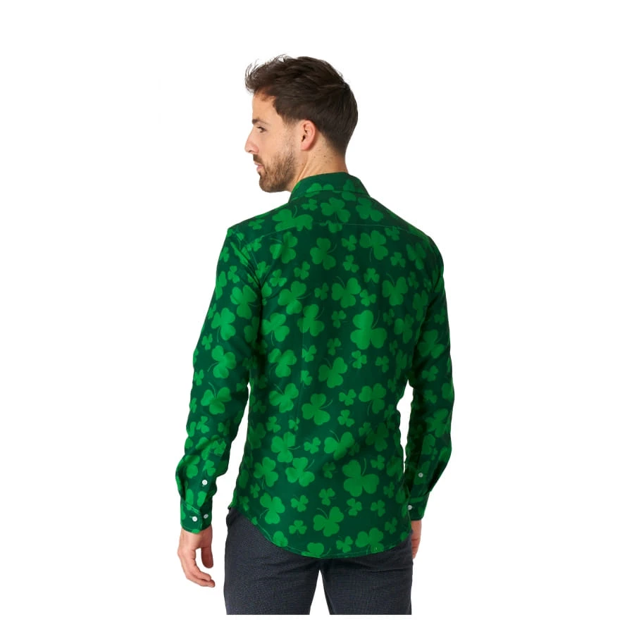 Cette chemise présente un fond vert foncé et des imprimés de feuilles de trèfle plus clairs sur toute la surface du vêtement.