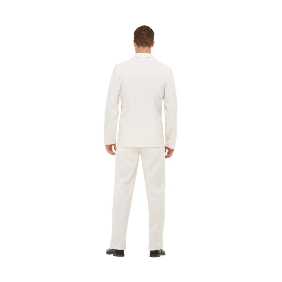 Ce costume est de couleur blanche et évoque un smoking des années rétro, avec un pantalon, une veste et une fausse chemise.