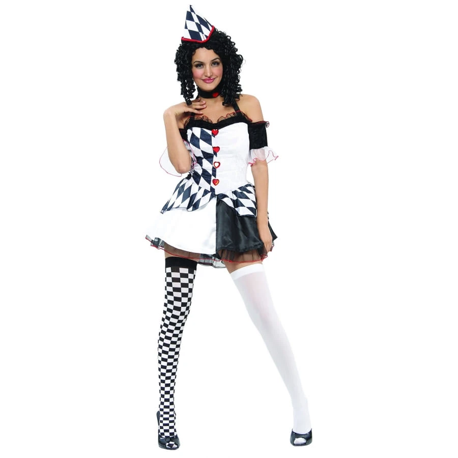 Un peu de fantaisie et d’originalité pour se faire remarquer ! Osez vous démarquer avec ce costume court de femme arlequin. Cette tenue assez courte mettra en avant votre silhouette. Elle est composée d’une robe de couleur blanche et noire, avec des motifs en damier. Retrouvez une légère touche de rouge sur le tulle au niveau du décolleté et des manchettes. La robe est composée d’une partie bustier à toucher velours, et d’une partie jupe en tissu satiné avec jupon en tulle intégré pour plus de volume. Le bustier se maintient à l’aide d’une lanière à nouer autour du cou. Pour ajuster la robe, vous disposerez de deux rubans à nouer dans le dos. La robe est équipée de deux petites manchettes cousues à passer autour des bras et maintenues par des élastiques. L’article comporte également un tour de cou à toucher velours, à fixer à l’aide d’un scratch, ainsi qu’un petit chapeau en mousse de couleur assortie à la robe.