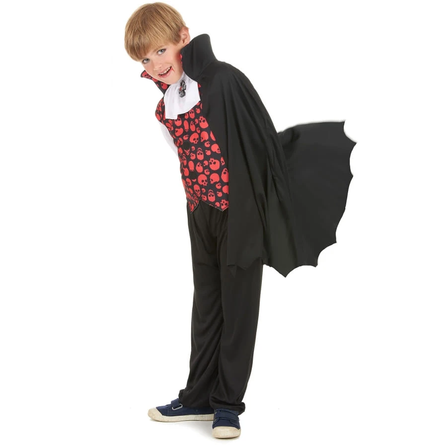 Pour que les petits garçons puissent recevoir leurs friandises facilement, nous vous proposons le costume de petit vampire imprimé têtes de mort.