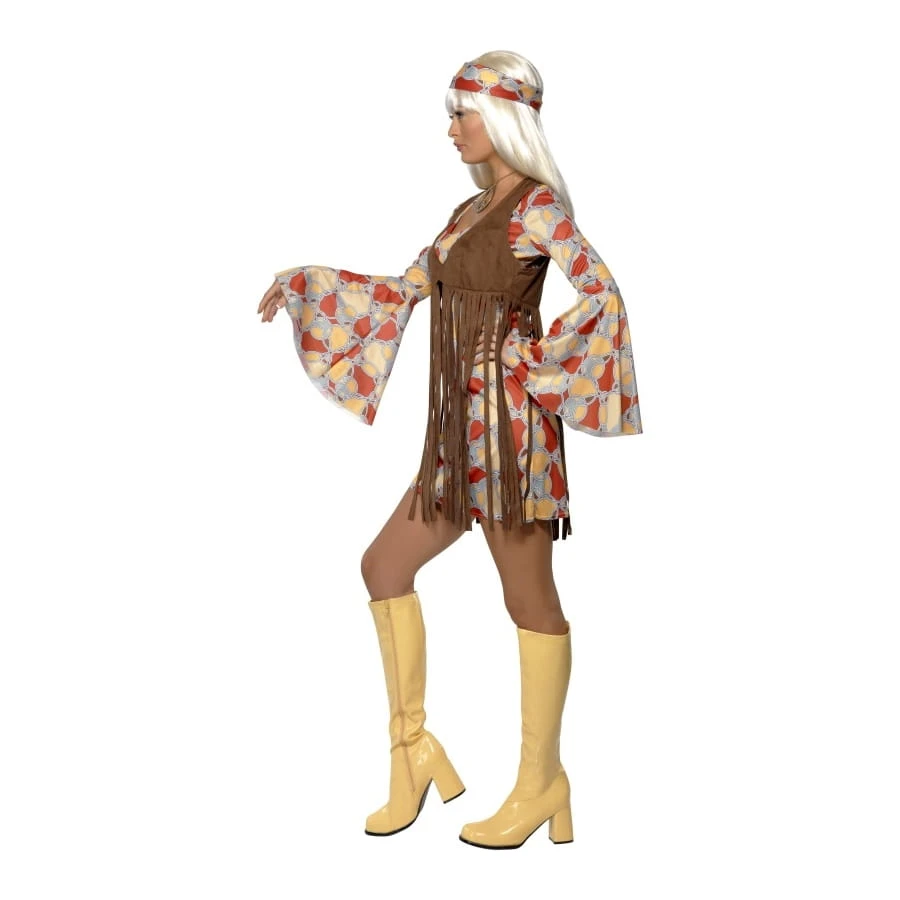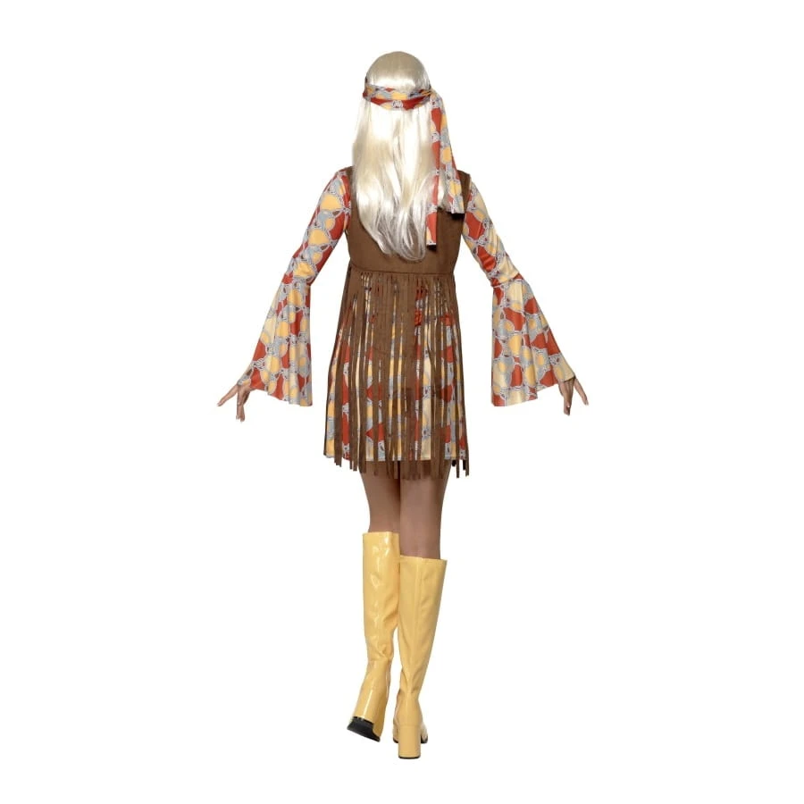 Relax avec cette robe multicolore Groovy baby et ce corset frangé de couleur marron. Cet ensemble est disponible en taille L, M ou S. Il est parfait pour une soirée disco un peu funky.