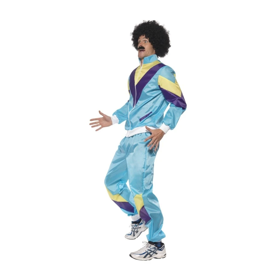 Déguisement de training style 80’s, pour homme, composé d’une veste et d’un pantalon de training de couleur bleue, avec bandes jaunes, blanches et violettes. Le tout est disponible en taille M, L ou XL. C’est un style qui était très populaire durant les années 80 et qui vous ira très bien pour une fête rétro.