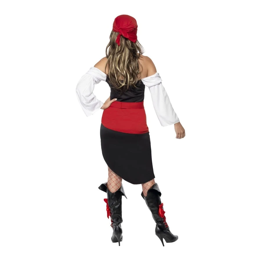 Déguisement de boucanière, pour femme, composé d’une jupe noire et rouge, d’un top noir et blanc, d’une ceinture et d’un foulard pour les cheveux, tous deux de couleur rouge. Ces éléments sont disponibles en taille S, M ou L. Devenez une boucanière fougueuse et aventureuse pour une fête basée sur le thème des pirates ou du cinéma.