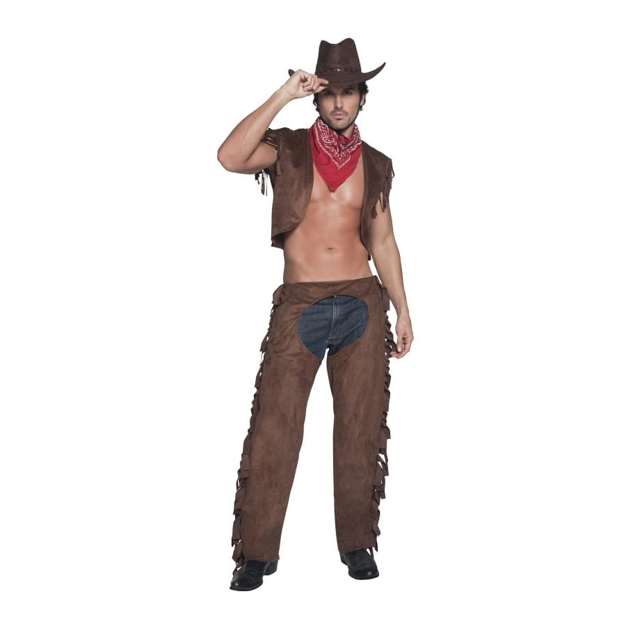 Déguisement de cowboy de couleur marron, pour homme, composé d’un gilet, de chaps et d’un foulard rouge. Ce déguisement peut être utilisé pour un look de star de cinéma, historique ou de western.
