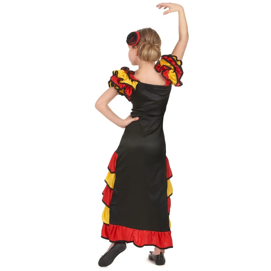 Habillée comme une danseuse de flamenco, votre enfant va rayonner sur la piste de danse. Le ravissant déguisement de danseuse espagnole pour fillette est disponible en différentes tailles pour les 4 à 12 ans. La belle robe longue de couleur noire est fendue à l’avant. Elle est ornée de froufrous rouges et jaunes liserés de noir sur la partie basse et au niveau des manches. De magnifiques roses en tissu de couleur rouges et jaunes ont été placées sur le haut de la fente et au niveau de la poitrine. La barrette pour les cheveux, quant à elle, est de couleur rouge et jaune et liserée de noir. Elle prend la forme d’une rose. Grâce à ses petites dents en plastique, cette barrette pourra être posée sur un chignon ou sur des cheveux lâchés. La señorita est fin prête pour mettre l’ambiance !