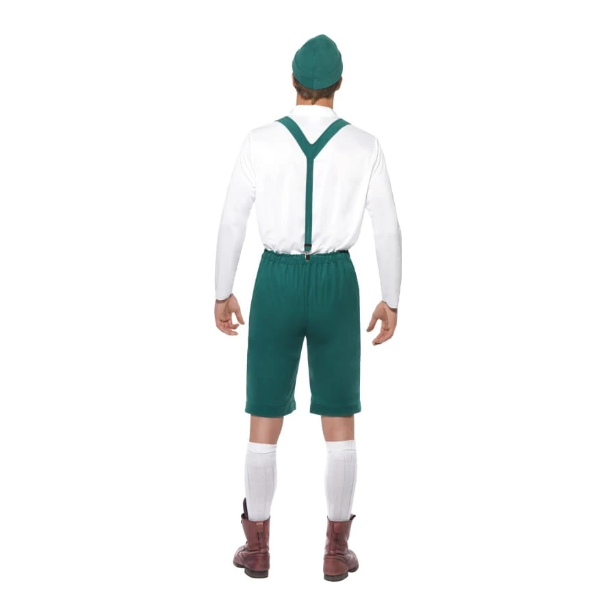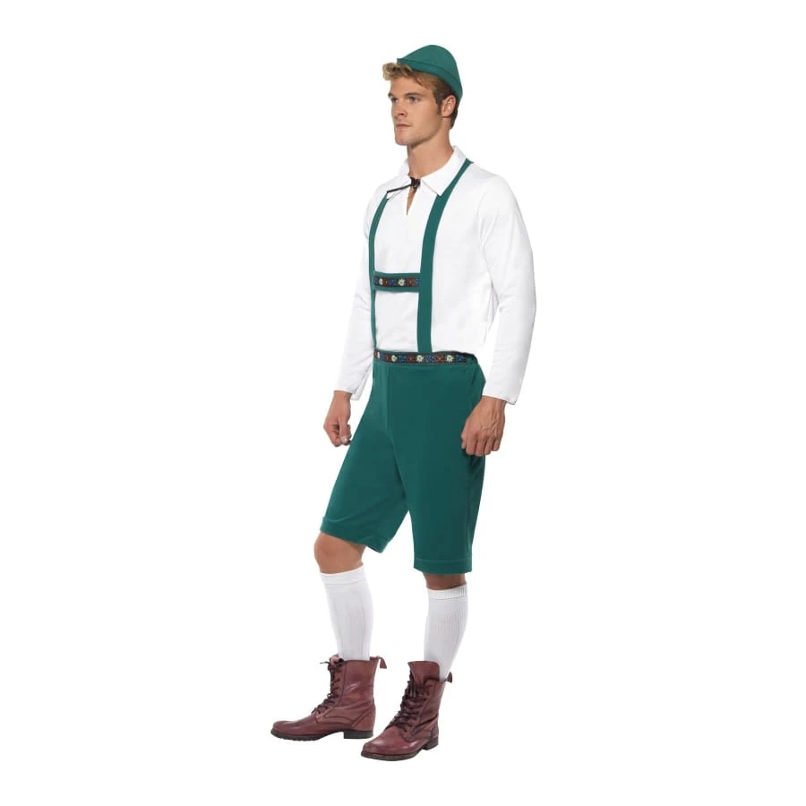 Déguisement de tyrolien, pour homme, composé d’un short bleu, d’un chapeau assorti et d’une chemise blanche. Cet ensemble est disponible en taille M, L ou XL. Il est idéal pour une fête folklorique ou pour un enterrement de vie de jeune fille.