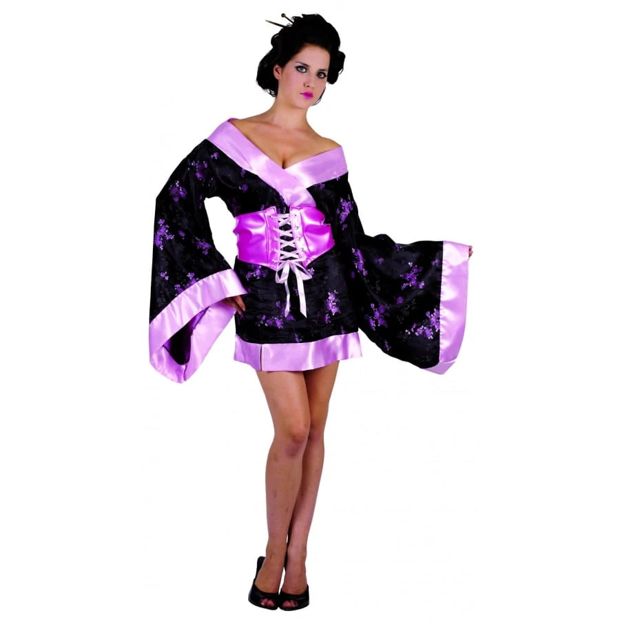 Du raffinement et beaucoup de talent pour la pratique de l’art japonais caractérisent les belles Geishas. Devenez-en une le temps d’une soirée de Saint-Valentin grâce à ce déguisement kimono court de geisha. Vous allez impressionner votre compagnon dans votre mini robe satinée noire avec motifs floraux roses. Les manches sont longues et évasées. Le col est légèrement décolleté et la découpe de la robe imite celle d’un kimono. Pour marquer la taille, une ceinture élastique avec ruban rose est fournie. Elle se noue tout simplement au dos. Pour un déguisement plus authentique, misez sur le maquillage. Découvrez un large choix de fond de teint, de fard à paupières et de rouge à lèvres sur votre site happyfete.