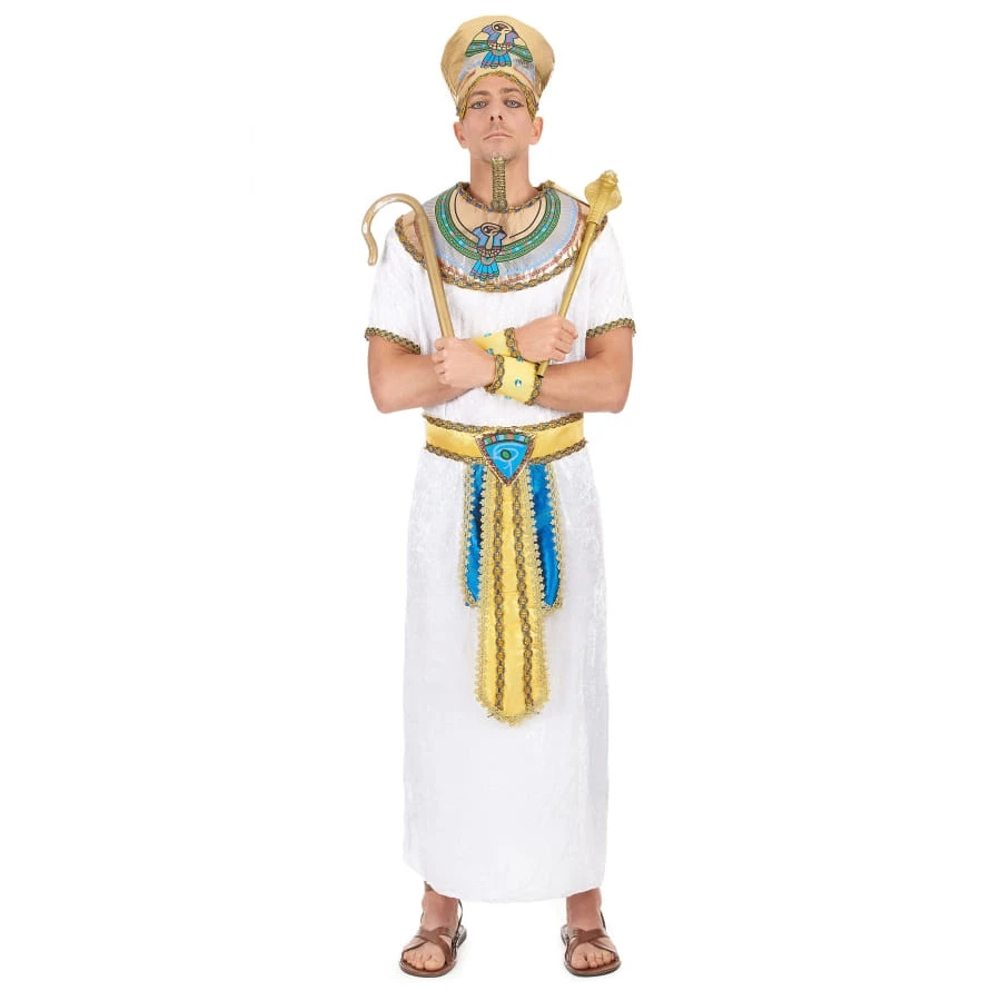 Le pharaon doit se parer de ses plus beaux vêtements avant de se présenter à une cérémonie. Pour incarner à la perfection le rôle d’un roi d’Egypte, adoptez le déguisement tunique de pharaon blanche et dorée. Ce costume est principalement formé par une longue robe blanche à manches courtes et à aspect velours. La taille sera ajustée à l’aide d’une ceinture à scratcher au dos. Une magnifique collerette est destinée à orner le haut de la robe. La grosse coiffe de pharaon vous donnera une allure digne d’un souverain d’Egypte. Ces accessoires sont décorés de motifs hiéroglyphes sur fond or et bronze. Pour vos poignets, vous disposerez de deux manchons à fixer à l’aide de scratches.