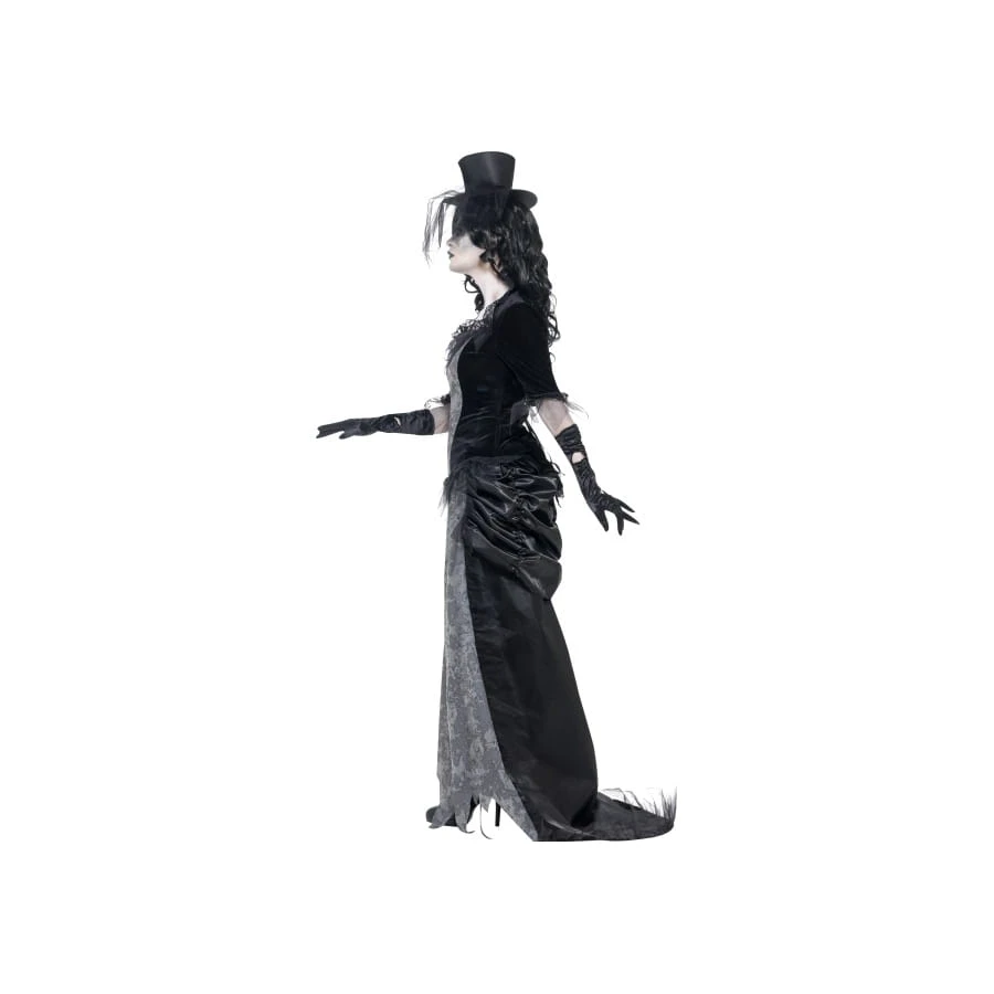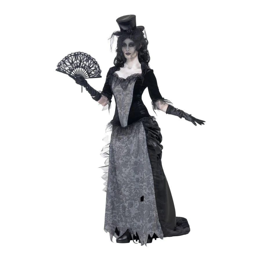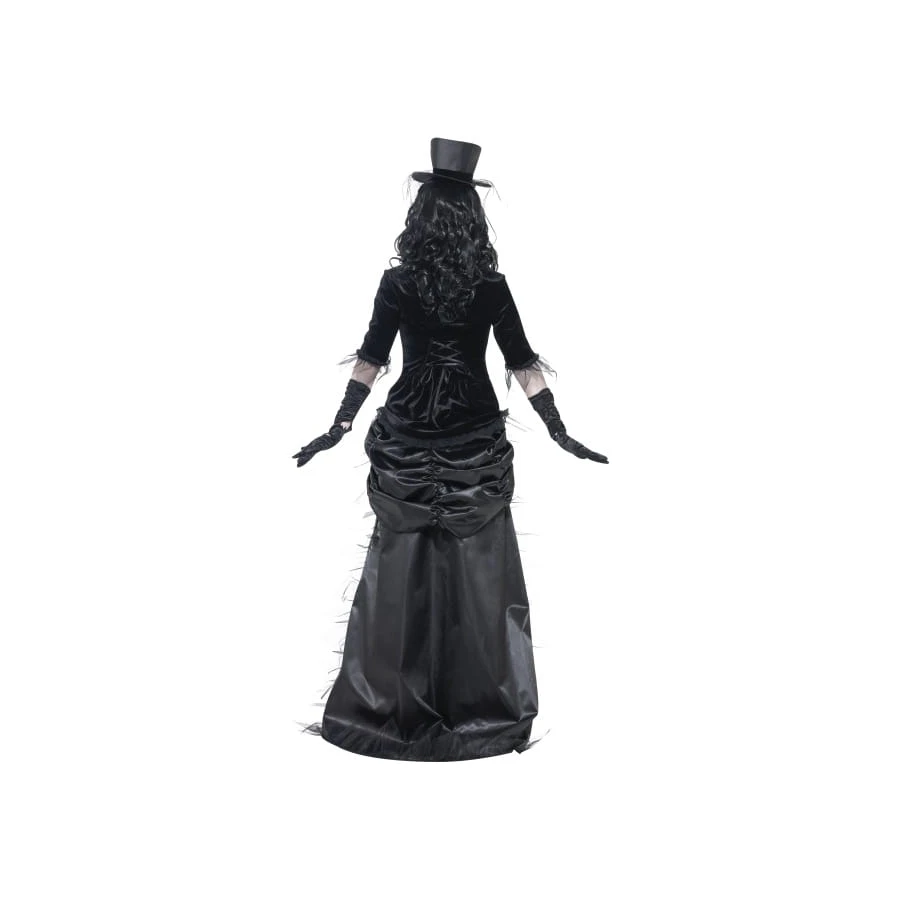 Ce déguisement de veuve noir fantôme vous pourrez le porter pour halloween ou encore une soirée sous le signe de l’horreur ou épouvante. Vous pourrez aussi le porter pour le carnaval. Il est composé d’un chapeau gris, d’un top noir et gris avec manche mi long, d’une jupe grise sur le devant et noir a l’arrière.