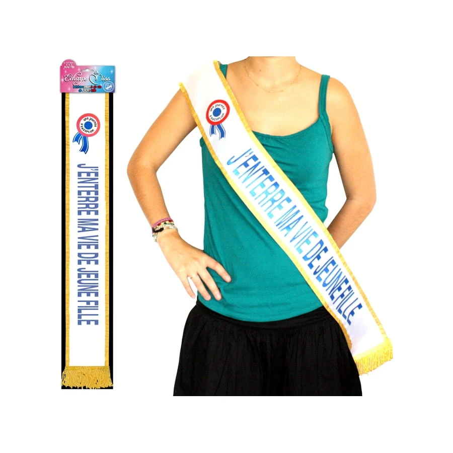 Plus que quelques temps et vous vous direz oui pour la vie ! Mais avant de passer cette étape, préparez avec soin votre enterrement de vie de célibataire. Vous serez la vedette de la soirée en portant cette écharpe j’enterre ma vie de jeune fille. Formée par un tissu blanc avec des liserés dorés, l’écharpe est parée de l’inscription « j’enterre ma vie de jeune fille » imprimée en bleu pailleté. Elle fait en tout une longueur de 184 cm.
