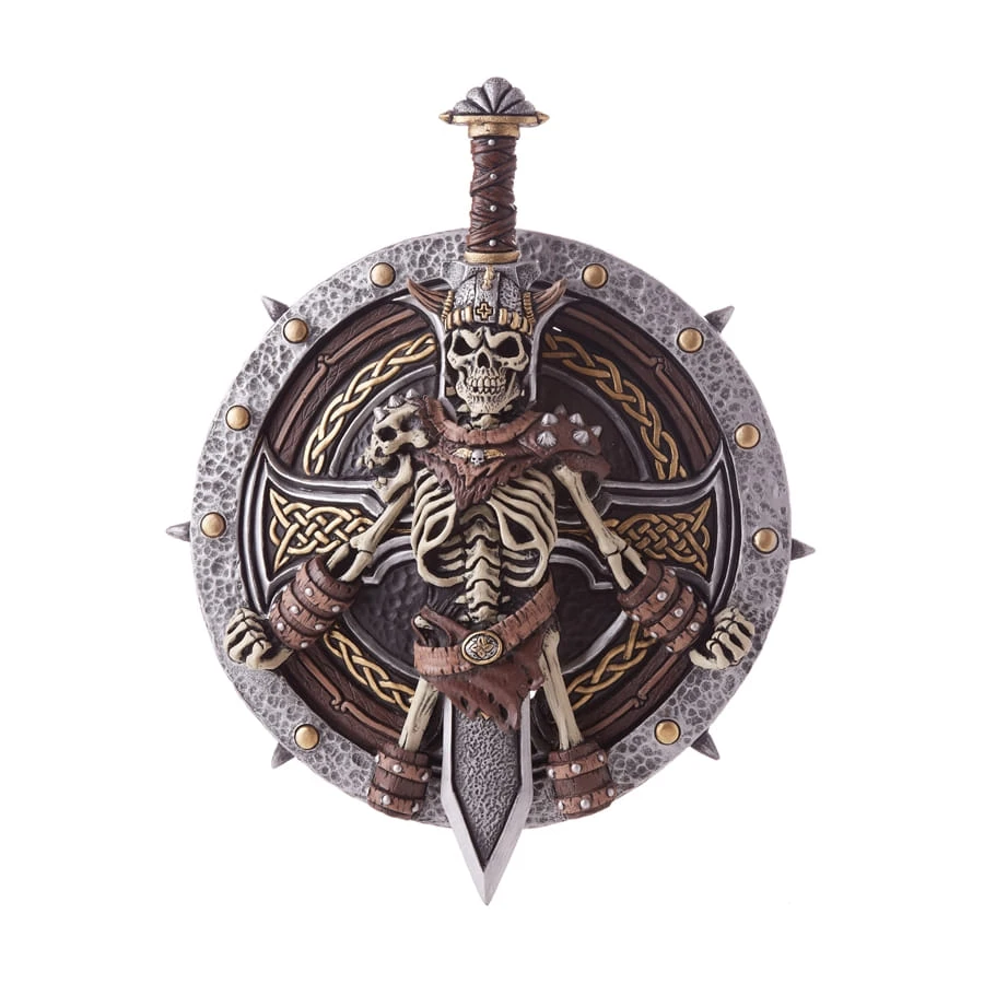 Ce superbe set d’accessoire épée et bouclier squelette de viking vous attend avec impatience dans notre site pour vous aider à animer votre fête. L’ensemble est de couleur marron et argentée. Le bouclier mesure 45,7 cm de diamètre, il est muni de piques argentés sur les bordures. L’épée est tenue au centre de ce bouclier par un squelette plus vrai que nature vêtu d’un costume de viking. Ces accessoires sont conçus pour hommes et petits garçons, ce sont des armes factices qui ne pourront causer aucun danger. Vous avez maintenant de quoi compléter votre costume de Viking à l’occasion de la prochaine fête déguisée ou pour la prochaine Halloween.