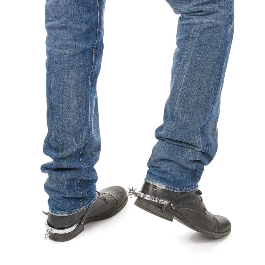 Cette paire d’éperons argentés de cowboy, en plastique, est appropriée à la gent masculine et féminine.