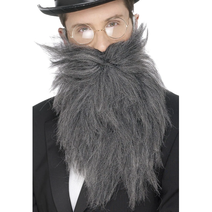 Fausse longue barbe grise et moustache assortie avec attache élastique pour homme. Cet accessoire est parfait pour se déguiser en personnage des années 70, en rabbin ou en Viking.