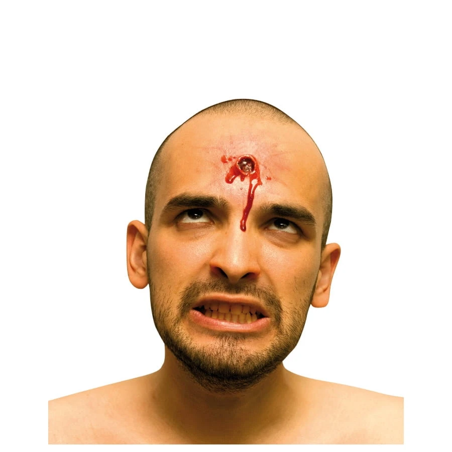 Soyez le plus gore pour la prochaine fête d’Halloween ! Quoi de mieux que d’être celui ou celle qui a reçu une balle en pleine tête ? Faux impact de balle cosmétique est un accessoire plein de réalisme qui vous permettra de faire très peur à vos amis. Il s’agit d’une fausse plaie en latex, très souple et sans danger pour la peau. Le kit est livré sans faux sang et colle spéciale, des compléments que vous pourrez retrouver sur notre site.
