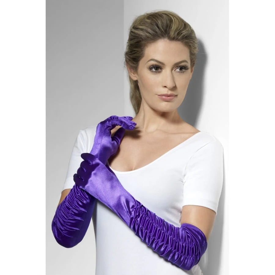 Paire de longs gants « tentatrice » de couleur violette, pour femme. Ces gants arrivent à la hauteur des coudes et est entièrement en satin. Les avant-bras sont froissés et ils donnent une apparence très glamour, parfaite pour un déguisement de séductrice.