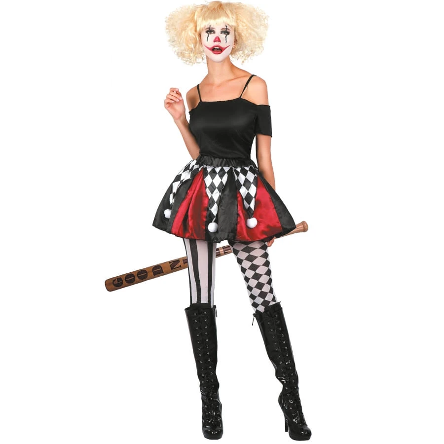 Pour votre prochain Halloween optez pour un personnage décalé avec la jupe d’arlequin rouge, blanc et noir pour femme.