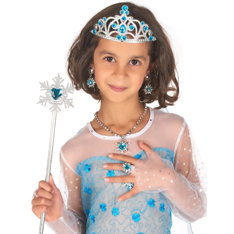 – 1 baguette de princesse argentée avec flocon de neige et fausse pierre bleue au centre.