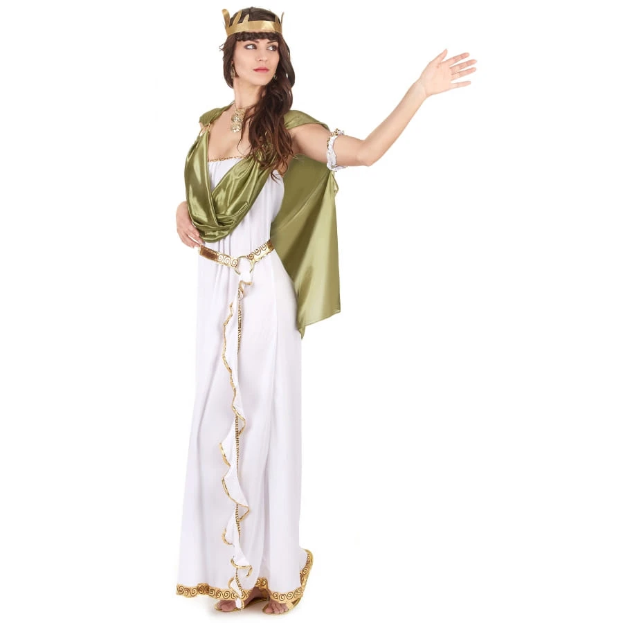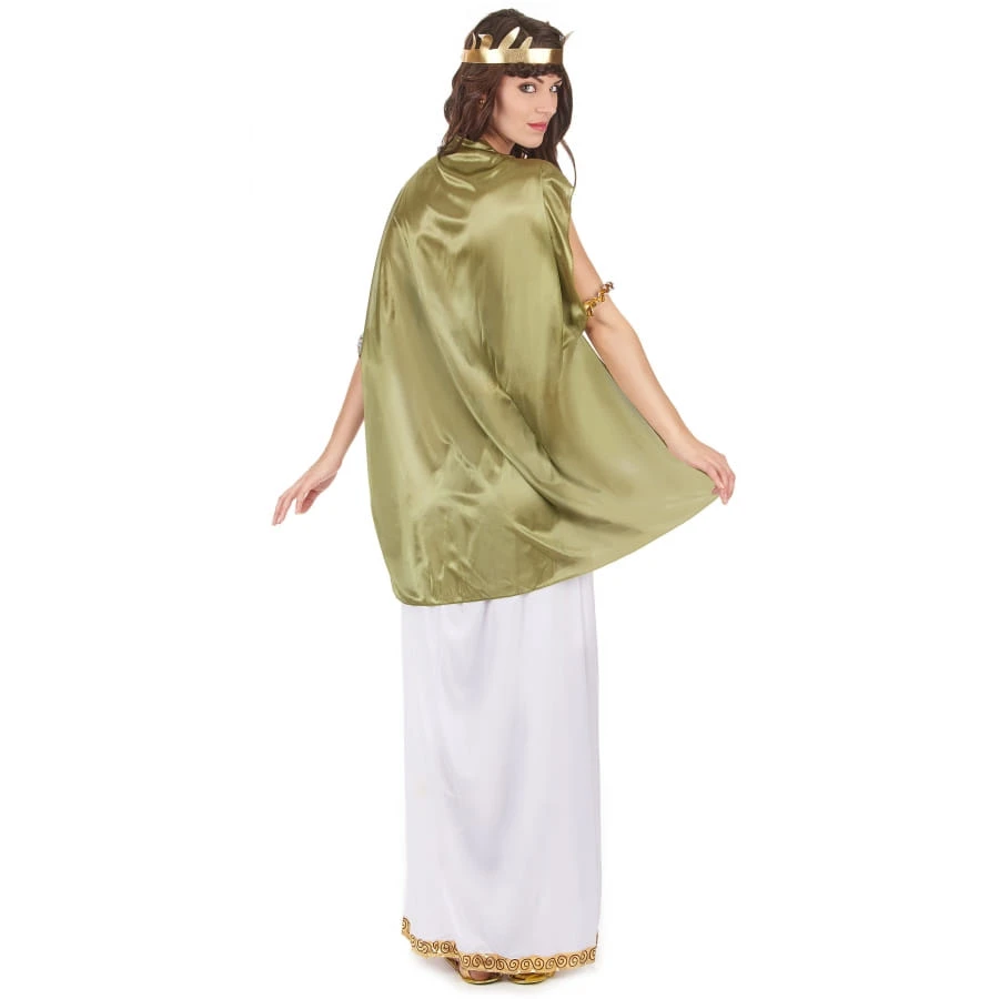 Devenez la réincarnation d’une déesse grecque ou romaine pour une soirée à thème. Faites honneur à une personnalité historique dans ce long déguisement blanc de déesse, toge verte. Vous porterez une longue robe bustier, élastique au niveau de la poitrine. Le tissu est fluide et très agréable à porter. La robe est blanche et agrémentée de liserés dorés. Une ceinture dorée est fournie pour cintrer la taille et sublimer les hanches, avec la pièce de tissu torsadée blanche liserée de dorures. Elle se fixera à l’aide d’un scratch. Une toge verte en tissu satiné vient recouvrir les épaules. Une cape avec bracelets élastiques intégrés habillera votre dos et accompagnera vos mouvements. Les anneaux en plastique servent de liens pour maintenir les différentes pièces de tissu. Une couronne de laurier de couleur dorée viendra accessoiriser votre coiffure afin de vous transformer en véritable divinité !