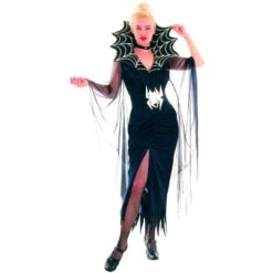 La longue robe cintrée araignée à grand col est un déguisement pour halloween. Elle associe le charme et la séduction d’une femme fatale au côté macabre de la fête des morts. Il s’agit d’une longue robe noire aux bords déchiquetés. Elle est taillée assez près du corps pour un effet très sexy. Ce caractère se trouve d’autant plus accentué grâce à la fente de la jupe arrivant jusqu’au niveau de la cuisse. Quant aux manches de la robe, elles sont larges et faites de voile noir. La tenue comprend aussi un grand col s’inspirant d’une toile d’araignée avec ses motifs. Celui-ci se compose de mousse épaisse pour bien tenir en place. Il en est de même pour la ceinture dont la boucle est une araignée.