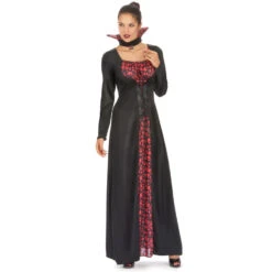 C’est un costume noir dans toute sa longueur, portant un laçage sur le devant et décoré, au centre, d’un tissu rouge présentant des motifs de crâne rouges.
