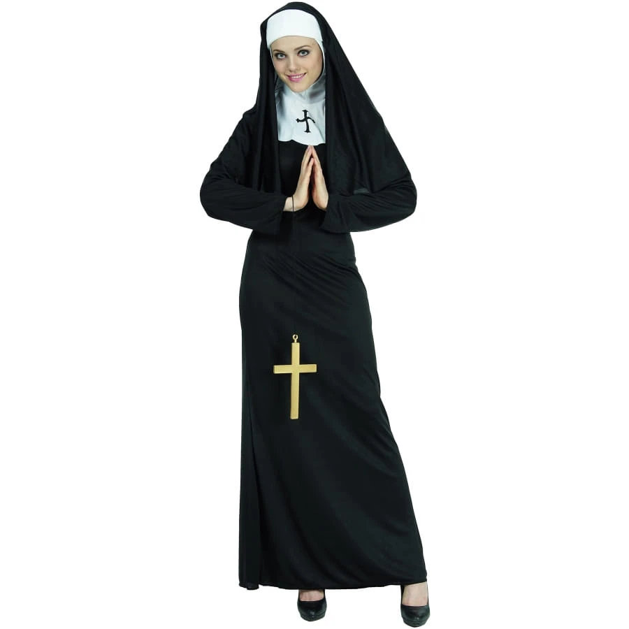 Devenir nonne n’a peut-être jamais été votre vocation. Par contre, il s’agit d’une merveilleuse idée de déguisement si vous voulez être originale. Avec cette longue robe de nonne pour femme, vous allez pouvoir animer haut la main un enterrement de vie de jeune fille. Vous interpréterez le rôle d’une religieuse dans une longue robe noire et blanche conçue dans un tissu fluide et agréable à porter. Les manches sont longues et légèrement évasées. La coiffe de bonne soeur est également fournie pour compléter l’ensemble. Un petit motif croix a été dessiné sur le devant au niveau du cou. Comme sur la photo, vous pouvez ajouter un collier avec pendentif en forme de croix à votre costume. Vous en dénicherez facilement dans la section accessoires du site happyfete. Il est temps d’entrer dans votre personnage, seul l’humour est le maître mot !