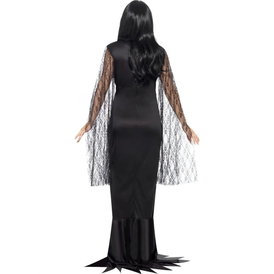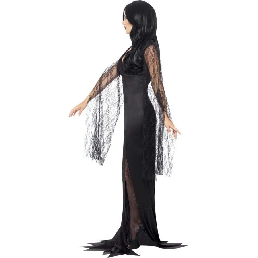Si l’immortalité vous intéresse, ce qui est certain, c’est que nous pouvons vous en offrir un peu avec ce déguisement d’immortelle représentée par cette longue robe d’immortelle que vous voyez ici. Ce costume est composé de cette longue robe, qui à elle seule rappelle la vie éternelle, tellement elle est sublime. Cette robe est entièrement de couleur noire et proposée en tailles L, M et S. Elle est décolletée, et ses manches sont représentées par une sorte de voile noire évasé, qui fait tout le charme de la robe. Elle est également très longue et possède une large fente sur le côté, elle représente à merveille le style sirène, au ras du corps pour l’ensemble et évasée vers le bas. Et en parlant justement du bas de la robe, vous aurez à ce niveau une découpe très spéciale.