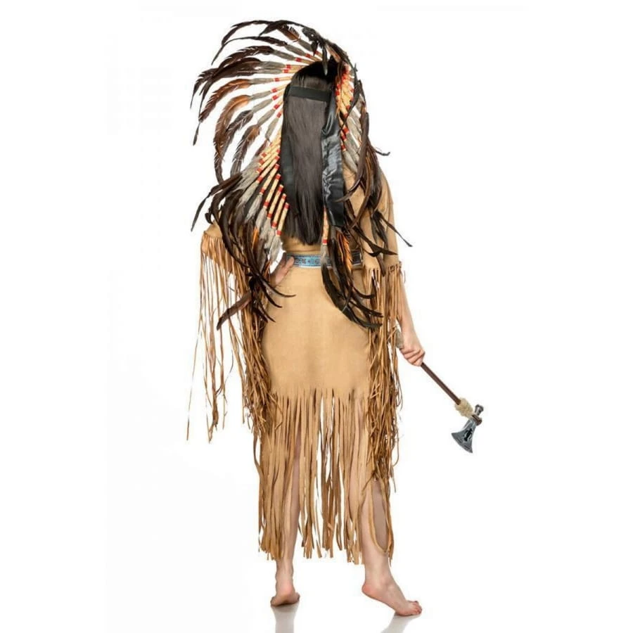 Pour une fête sur le thème de l’Amérique, découvrez cette Robe d’indienne marron à franges avec coiffe, luxe.