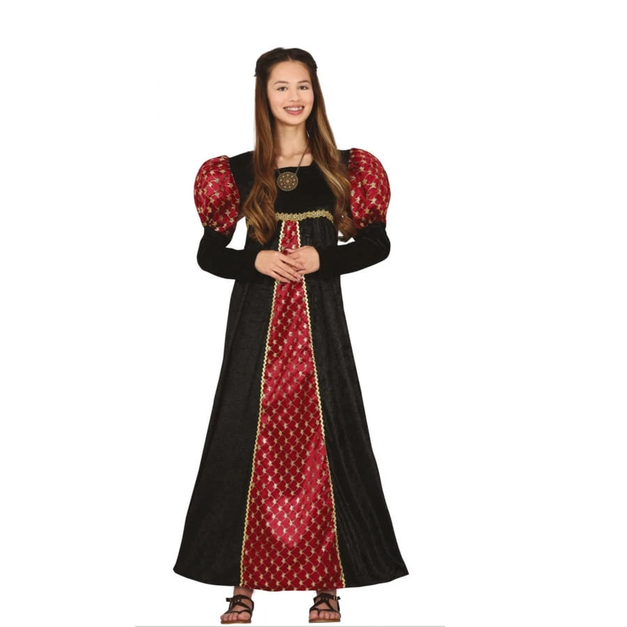 La robe de petite fille médiévale rouge et noire est la tenue idéale à l’occasion d’un spectacle sur le thème du moyen âge.