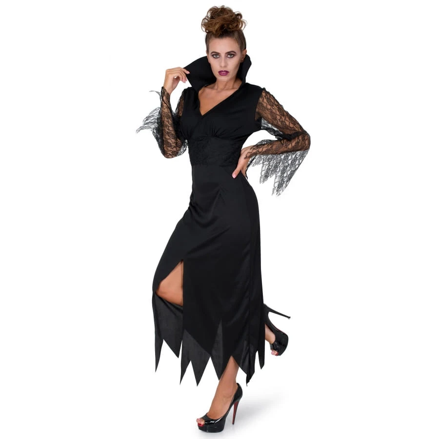 Voici présenté ici une robe noire de sorcière manches transparentes.