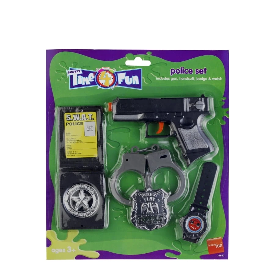 Set de policier, pour homme ou garçon, composé d’un fusil, de 2 badges, de menottes et d’une montre. Un des badges est en forme de porte-feuille tandis que l’autre est sous forme d’insigne argentée. Déguisez-vous en policier membre des forces spéciales.