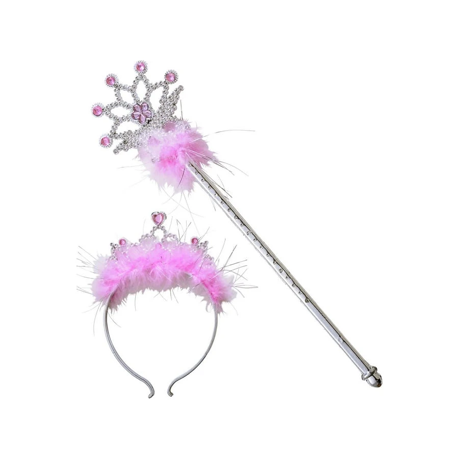 Set de déguisement de princesse pour enfant composé d’une tiare et d’une baguette de couleur argent et rose. La baguette est ornée de pierres et de plumes de couleur rose. Ce set est idéal pour un anniversaire d’enfant.