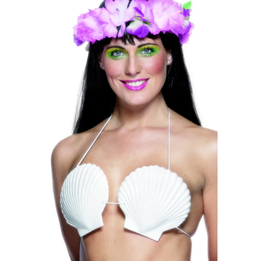 Soutien-gorge en forme de coquillage de couleur blanche, pour femme ou adolescente. Le soutien-gorge est retenu par un cordon. Assortez-le à un pagne hawaïen ou à une queue de sirène pour vous déguiser en vraie déesse exotique!