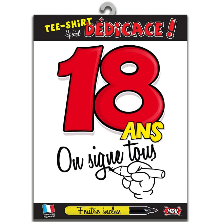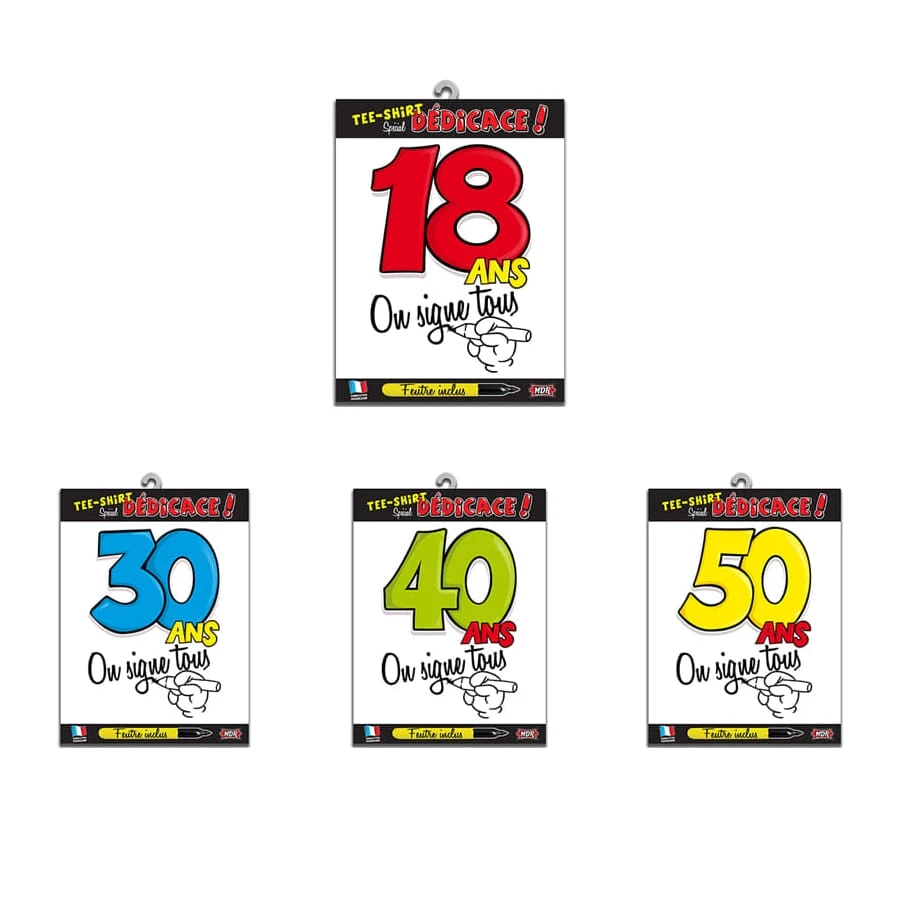 Offrez un cadeau original à une personne spéciale. Ce t-shirt d’anniversaire à dédicacer fera office de cadeau en commun pour marquer d’une pierre blanche une journée particulière. Vous aurez le choix entre différents modèles selon l’âge de la personne : 18 ans, 30 ans, 40 ans ou 50 ans. L’article est constitué par un t-shirt blanc en coton sur lequel l’âge est imprimé en couleur. Un feutre est fourni pour permettre à tous de laisser un petit souvenir en ce jour mémorable.