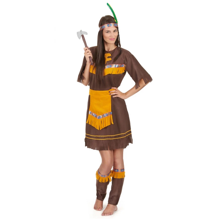 Soyez indienne de la tête aux pieds avec cette tenue d’indienne cintrée marron et orange. Il s’agit d’une belle robe marron, cintrée à la taille, ornée de motifs indiens. Des franges décorent le bas de la robe et les manches, et un tissu orange, en franges au niveau de la poitrine et en petit tablier à la taille, vient enjoliver le tout. Des jambières marron à franges orange sont à porter aux pieds, et un bandeau à motifs avec plumes jaune, verte et blanche se mettra autour de la tête. Lance ou tomahawk sont de rigueur, à retrouver parmi nos accessoires, et il est conseillé de se mettre pieds nus pour bien se plonger dans la peau du personnage.