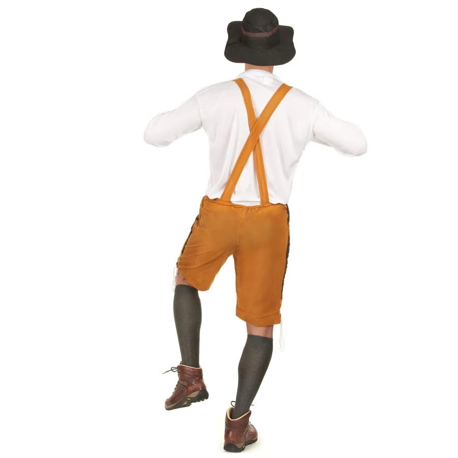 Vous êtes à la recherche d’un style vestimentaire qui ne manque pas d’allure et de personnalité ? Inspirez-vous de la tradition bavaroise pour obtenir le look le plus original. La tenue de bavarois en salopette marron constitue le parfait modèle pour assister à une soirée à thème. Elle est formée par un haut blanc à manches longues avec col imitation chemise. La salopette qui va avec est obtenue à partir d’un pantacourt marron orangé en tissu effet velours et équipé de bretelles. Celles-ci se fixent à l’aide de scratchs et sont décorées de quelques broderies aux extrémités. L’accessoire fourni avec le déguisement est un chapeau noir en feutrine. Il est conseillé de porter de longs bas pour accompagner ce look.