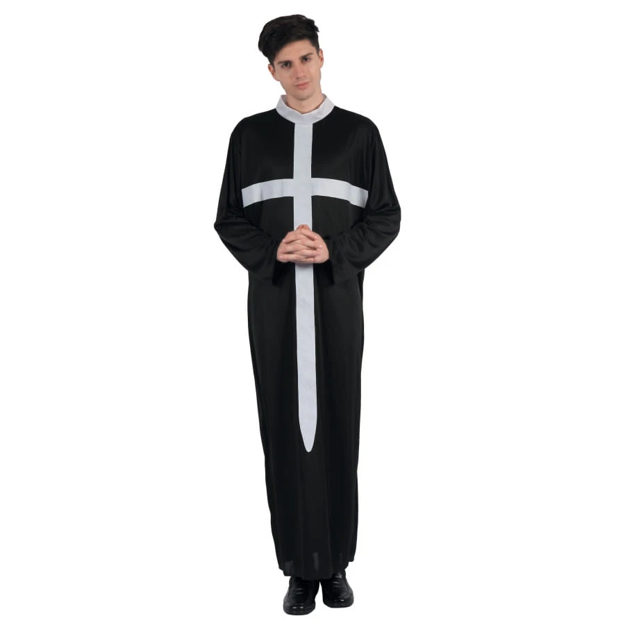 Cette tenue noire de prêtre imprimé croix blanche est longue avec des manches larges.